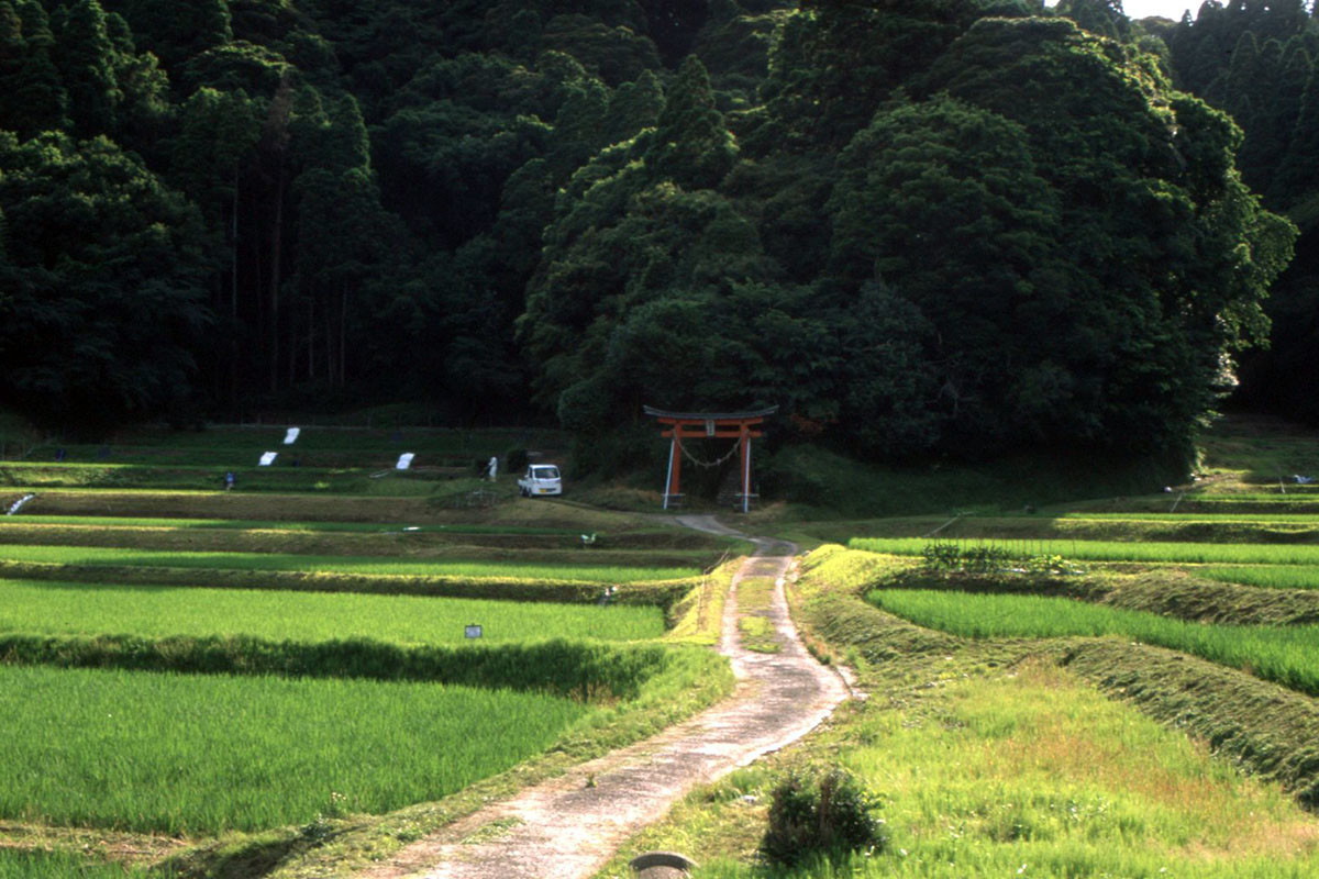 奥に鳥居、右側は丘の下で民家が広がっている。