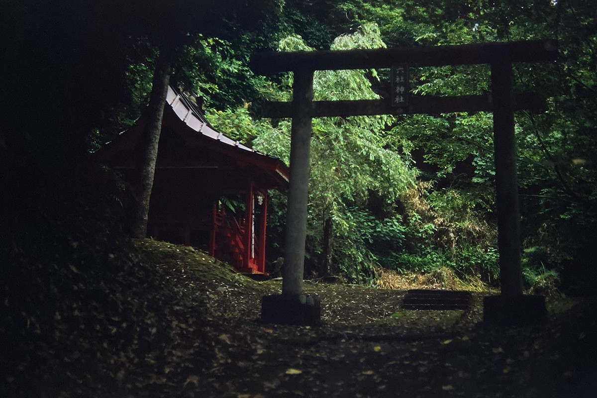 六社神社。この道の奥に鎮座している赤い社は緑とのコントラストで気分が盛り上がった。
